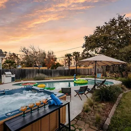 Dining options at the 5Bd 3 Ba Atx Pool Hot Tub Theater Arcade are tailored to ensure culinary pleasure. An equipped kitchen enables you to prepare meals with ease or simply enjoy dining al fresco by the poolside. The villa exudes charm, making every meal feel like a special occasion.